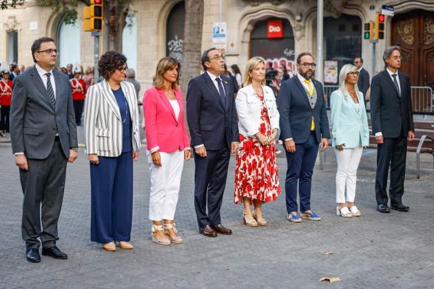 Representantes del Gobierno del PSC, con Salvador Illa al frente, acompañados por los Mossos d'Esquadra durante el acto conmemorativo.