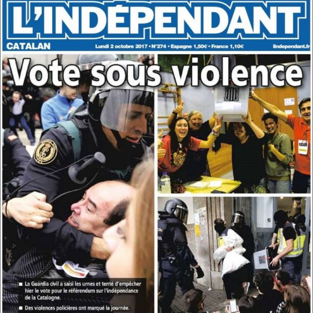El diario L'Indépendent de Perpinyà hizo ayer un seguimiento continuo del referéndum catalán, con noticias continuas, galerías de fotos y de vídeos, entrevistas a testigos e informaciones de la situación en los pueblos fronterizos. Uno de los elementos que destaca este periódico es el silencio flagrante de las autoridades francesas con respecto a estos hechos. Hoy la portada, bajo el título "Voto bajo violencia", destaca que las violencias policiales han marcado la jornada.