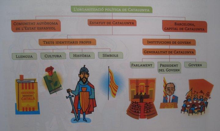 Se presenta la organización de Cataluña con sus características identitarias sin ninguna referencia a España ni a la lengua española. Al referirse a las instituciones de gobierno, solo se hace referencia al “Parlament”, al “President del Govern” y al “Govern”, sin ninguna referencia al Congreso de los Diputados, ni al Rey ni al Gobierno de España. Sorprendentemente, se dice que Barcelona es la capital de Cataluña, de la misma forma que se podría decir que París lo es de Francia.
