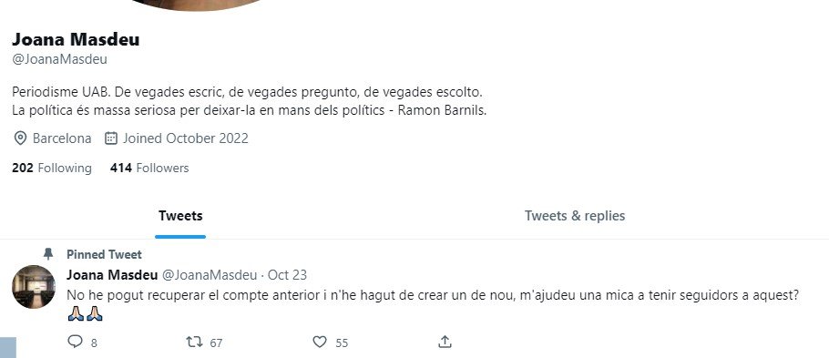 Mañana de intriga en Twitter en torno al caso Dalmases después de la aparición de una cuenta falsa -ahora ya eliminada- de una supuesta periodista, de nombre Joana Masdeu, que ha salido en defensa del vicepresidente dimitido de Junts. La cuenta de Masdeu hace nada más unos pocos días que se había abierto y este miércoles ha empezado a coger impulso gracias a un hilo donde la supuesta periodista criticaba a los profesionales de la prensa que han aprovechado el asunto Dalmases para criticarlo mientras que, en cambio -según denunciaba ella misma-, no lo han hecho cuando han recibido presiones de otros políticos. El hilo ha empezado a correr por la mañana en mensajes de Whatsapp de periodistas que habitualmente cubren el Parlament preguntándose si alguien conocía a la desconocida Joana Masdeu. El hecho cierto es que, a medida que pasaban las horas, nadie conseguía identificar quien era la periodista que parecía disponer de información precisa sobre la vida parlamentaria y que, en cambio, nadie conocía. Masdeu no figuraba ni siquiera en los registros del servicio de prensa del Parlament. Entonces los periodistas han empezado a denunciar que la cuenta era falsa y finalmente quien lo haya dado de alta lo ha cerrado.