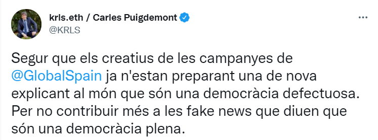Carles Puigdemont ha sido de los primeros a reaccionar a la caída de España en el ranking elaborado por The Economist, en lo que ha pasado de ser considerado una democracia plena a una democracia defectuosa, al sacar muy mala nota en el indicador de independencia judicial por el bloqueo del Consejo General del Poder Judicial. El president ha publicado un mensaje en las redes en lo que ha ironizado sobre la agencia Global Spain. Esta cuelga del ministerio de Exteriores y en años anteriores hacía lucir la posición de España en este tipo de rankings cuando se retraía al Estado la pérdida de la calidad democrática durante el procés, con la violencia policial del referéndum del 1 de octubre y también por la sentencia contra los presos políticos. "Seguro que los creativos de las campañas de Global Spain ya están preparando una nueva explicando en el mundo que son una democracia defectuosa. Para no contribuir más a las fake news que dicen que son una democracia plena".