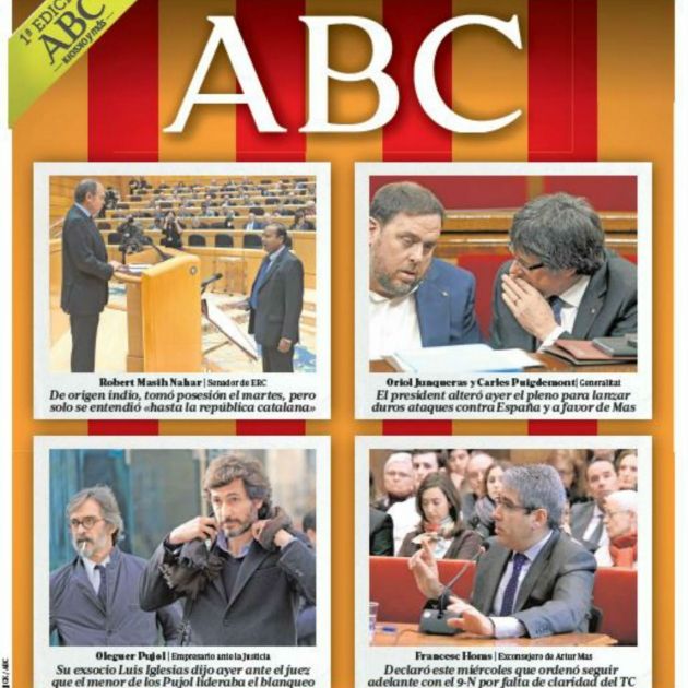 Pocas veces se podrá ver la portada del ABC con una senyera gigante, que sirve de fondo a una especie de historia sobre el proceso explicada con fotografías de los líderes soberanistas en forma de viñeta bajo el título "El proceso, un día cualquiera".