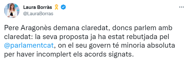 También se ha referido al discurso del presidente Aragonès la presidenta de Junts, Laura Borràs. En su caso, y en línea con lo que ha expresado Turull, la presidenta suspendida del Parlament le ha reprochado no haber hecho ninguna referencia al "incumplimiento más flagrante de su discurso de investidura: hacer efectiva la independencia". Borràs se refería a las palabras de Aragonès el 20 de mayo de 2021, en el discurso previo a su investidura: "Quiero ser presidente de la Generalitat para culminar la independencia de Catalunya". Un año y medio después, Borràs lo ha acusado de haber partido la mayoría independentista en el Parlament, y "malbaratar la mayoría del 52%".