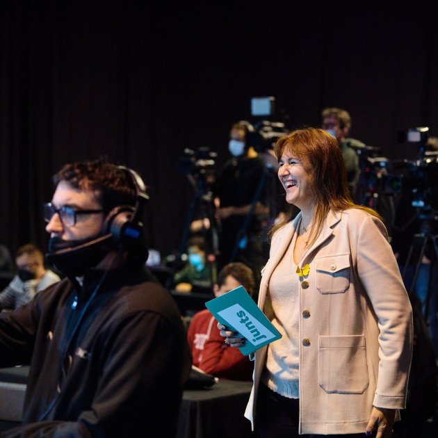 En la imagen principal, Laura Borràs tras las cámeras en el acto de apertura de campaña desde un plató de Sant Just Desvern / Julio Díaz