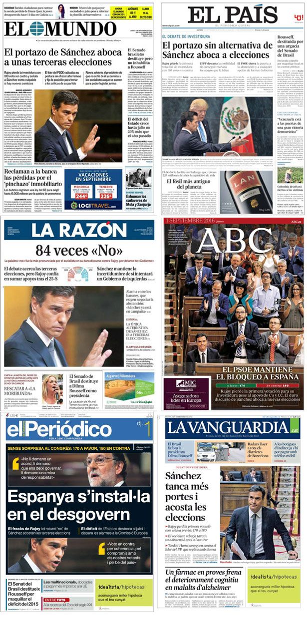 Los diarios de Madrid ya han hecho a Mariano Rajoy presidente hace días y Pedro Sánchez es un aguafiestas que quiere fastidiarlo. Por eso, este jueves se le han echado encima las portadas, acusándolo de dar un "portazo" al candidato popular y, de rebote, a la estabilidad de España, a su futuro, a los anhelos de los ciudadanos, a la paz de las familias. El apocalipsis. "Portazo de Sánchez", coinciden El Mundo y El País. "Bloqueo", dicen Expansión y ABC. La Razón se suma con su "84 veces no", acompañado, como sus colegas de la capital de España, de una foto de... Pedro Sánchez. Hace lo mismo el diario más vendido en Catalunya, que titula: "Sánchez cierra más puertas".