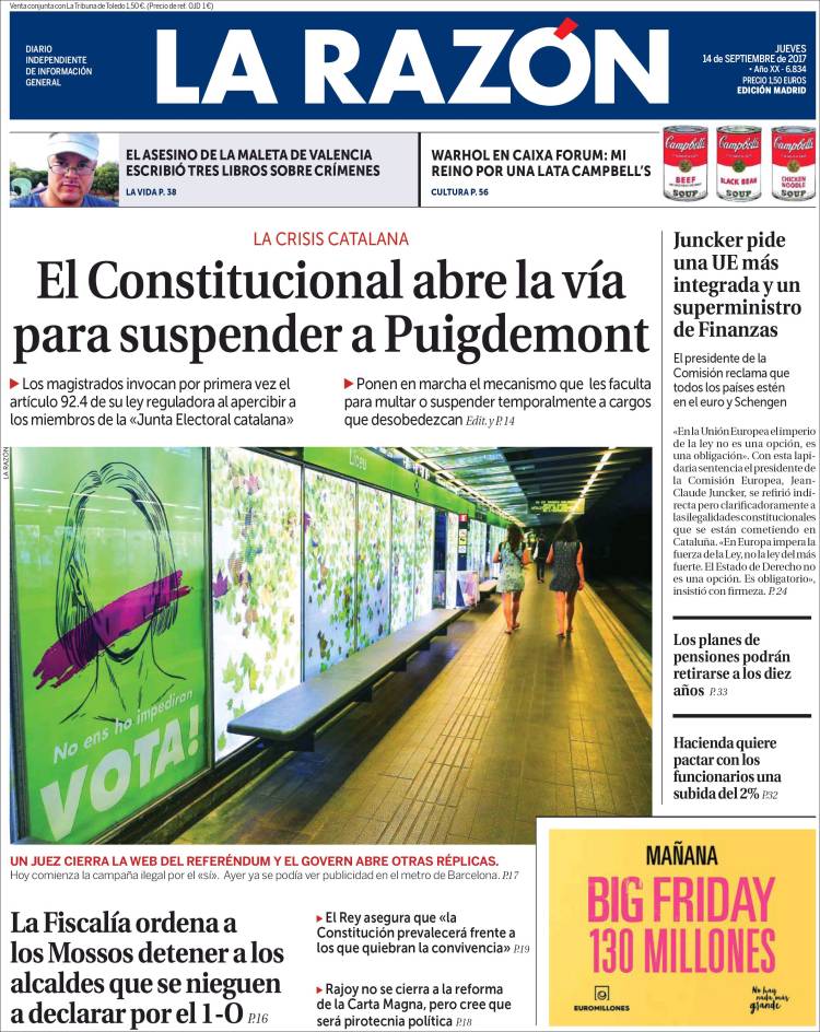 El diario La Razón avanza en su portada de hoy que el TC suspenderá al president de la Generalitat, Carles Puigdemont, de su cargo. El diario de Planeta expone, bajo el epígrafe 'La crisis catalana', que los jueces del alto tribunal "invocarán por primera vez" el artículo 92.4 de la ley del TC con la mirada puesta en los miembros de la Junta Electoral Catalana.