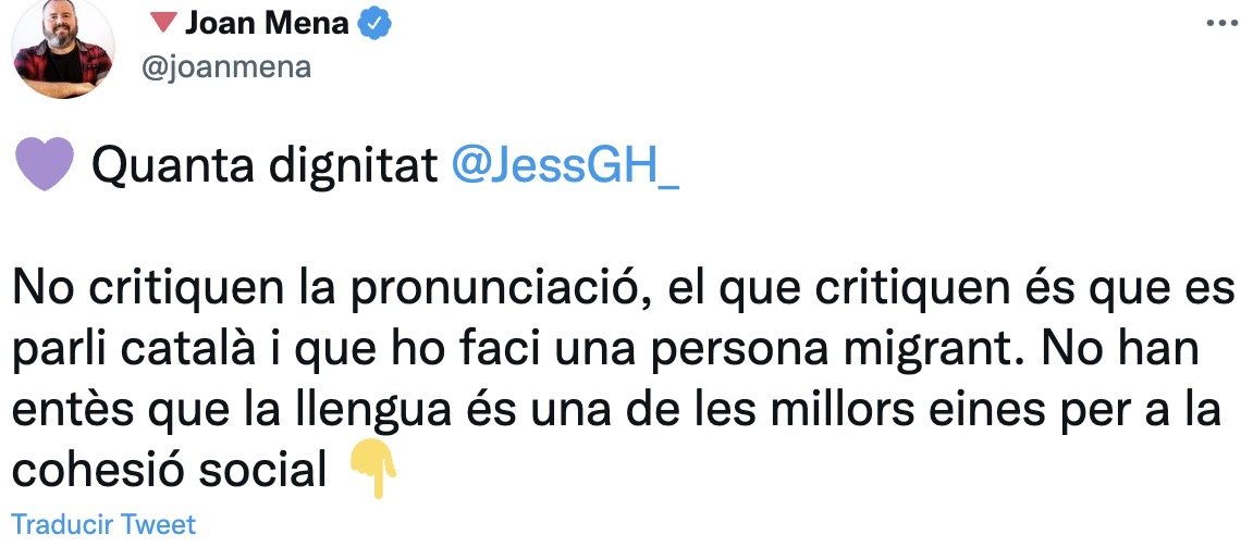 Por su parte, el portavoz de los comuns y diputado en el Congreso de los Diputados, Joan Mena, ha alertado que el partido naranja no critica la pronunciación, sino que una persona migrante hable en catalán.