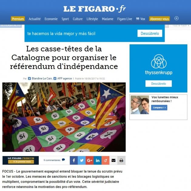 Para empezar, el medio indica que "ahora que se ha hecho oficial la votación" se han multiplicado las medidas legales y judiciales contra la causay remarca que la última noticia es la intervención de material electoral a cargo de la Guardia Civil. Lo justifica diciendo que "el Gobierno español teme que un 'sí' signifique una crisis política, aunque diga que no reconocerá la votación". Por otra parte, Le Figaro informa de que desde principios de septiembre, y a pesar de las medidas que se están tomando, el Govern catalán asegura tenerlo preparado para el 1 de octubre".