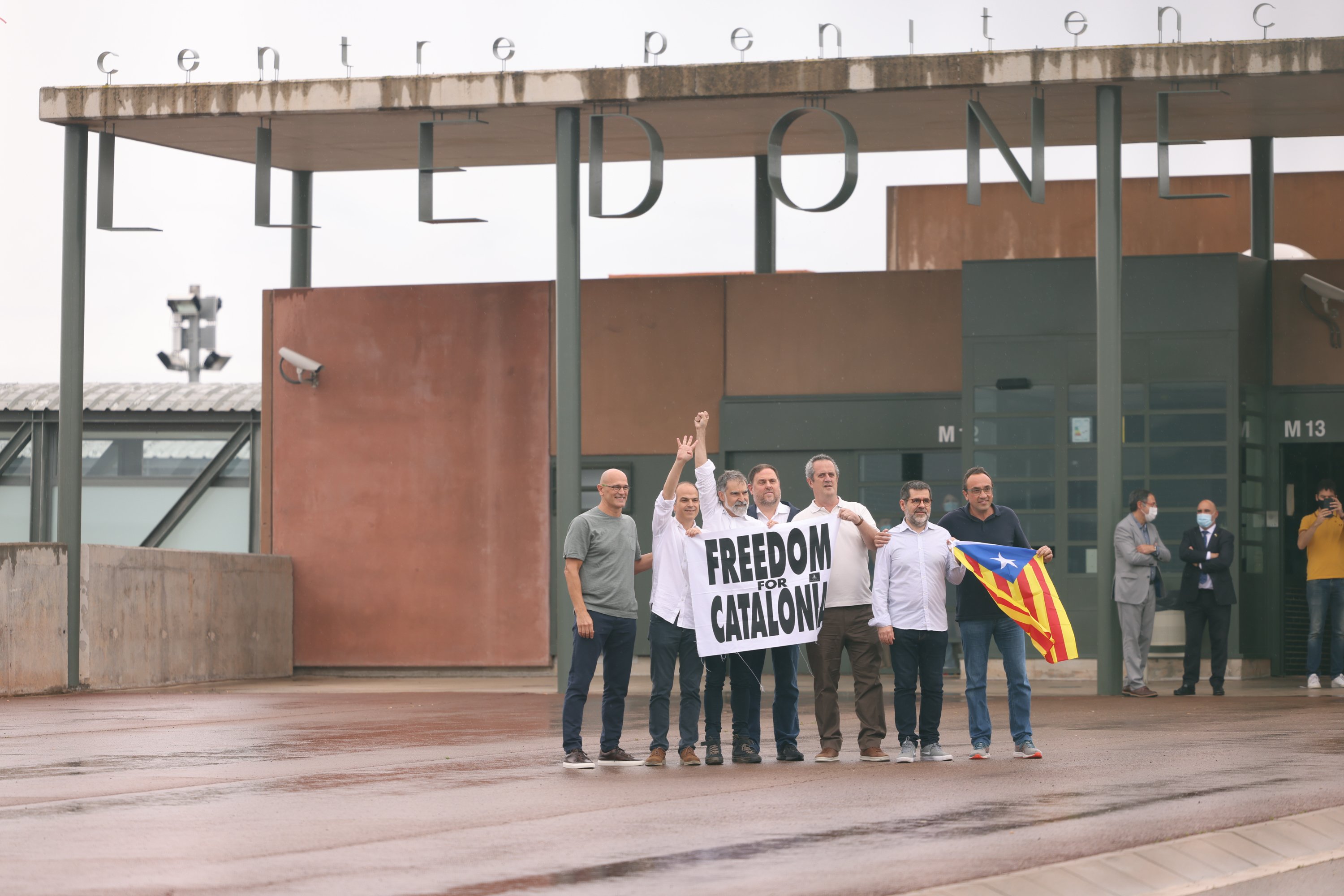 La salida ha sido conjunta, con foto de grupo y una breve declaración en las puertas de Lledoners, la prisión donde han estado encerrados buena parte de los 1.300 días entre rejas.