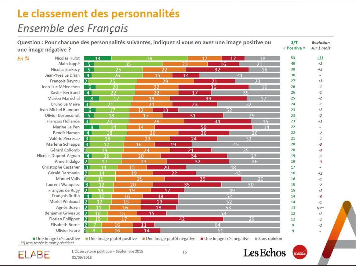 El político mejor valorado por los franceses es el hasta ahora ministro de Ecología, Desarrollo Sostenible y Energía, Nicolas Hulot, que dimitió recientemente por estar en desacuerdo con el presidente Emmanuel Macron. A continuación se sitúan el exprimer ministro Alain Juppé y el expresidente Nicolas Sarkozy.