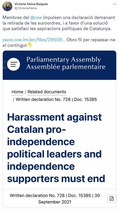 Miembros del Consejo de Europa han impulsado una declaración pidiendo que se retiren las euroórdenes contra los líderes independentistas y exigiendo "una solución que satisfaga las aspiraciones políticas de Catalunya", según ha informado la consellera de Acción Exterior, Victòria Alsina.