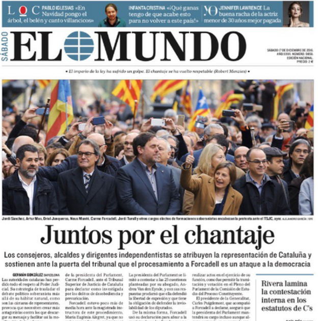 "Juntos por el chantaje", así es como El Mundo titula en su portada la declaración de Carme Forcadell delante del TSJC, haciendo un juego de palabras con el nombre del partido Junts pel Sí con una clara intencionalidad. La fotografía es para Forcadell y los líderes soberanistas que ayer acompañaron a la presidenta del Parlament a declarar, después de ser citada como investigada para permitir las votaciones de la Comissió del Procés Constituent. Como subtítulo, el diario español asegura que "consellers, alcaldes y dirigentes independentistas se atribuyen la representación de Catalunya y sostienen delante de la puerta del tribunal que el procesamiento a Forcadell es un ataque a la democracia".