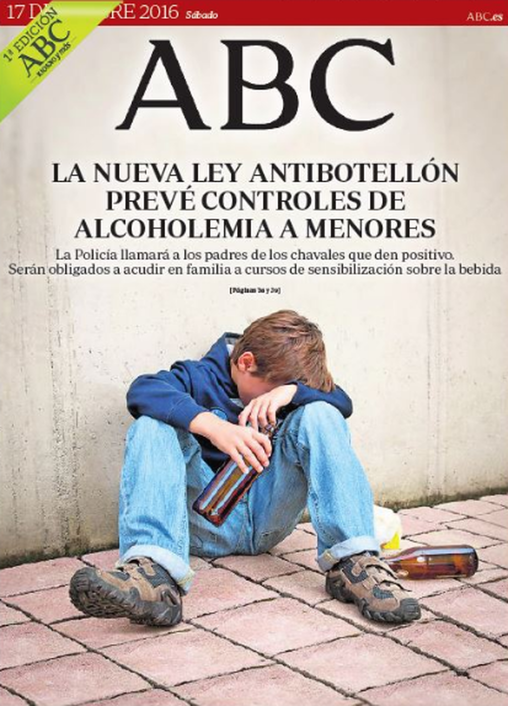 Finalmente, el diario ABC dedica toda la portada a la nueva ley antibotellón, que prevé más controles de alcoholemia a menores, con una fotografía de un menor bebiendo cerveza. Ni rastro, pues, de Forcadell.