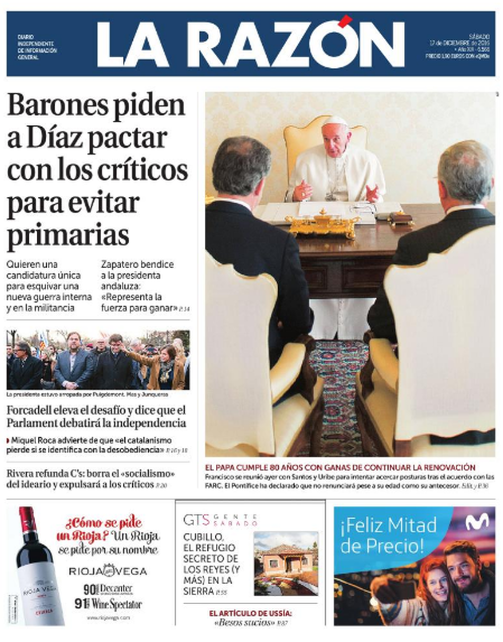 La Razón tampoco lo pone en el primer plano de la portada, ni el titular principal ni la fotografía son para Forcadell, pero sí que le da un espacio bastante más destacado que El País. El titular señala que "Forcadell eleva el desafío y dice que el Parlament debatirá la independencia", la fotografía es para Carme Forcadell, Carles Puigdemont y Oriol Junqueras, mientras que el expresidente Artur Mas sale en un segundo plano.