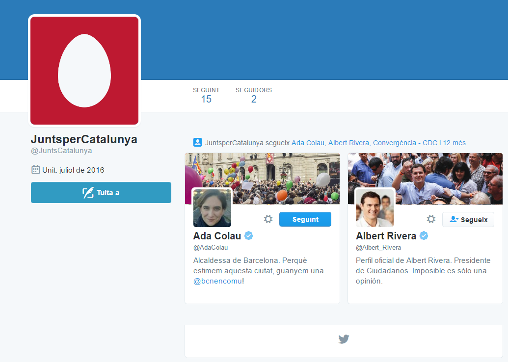 Finalmente en Twitter también existe un Junts per Catalunya @JuntsCatalunya, en este caso con un perfil no muy elaborado y con el característico huevo que aparece cuando está sin avatar. Esta cuenta también ha sido creada este mes de julio y no tiene todavía ningún tuit. Sigue, eso sí, a 15 personas y partidos, entre ellos CDC, ERC, PSC, PP, PSOE, Podemos, IU, y desde de Ada Colau a Mariano Rajoy pasando por Pablo Iglesias. Sólo tiene 2 seguidores, desconocidos para el gran público.