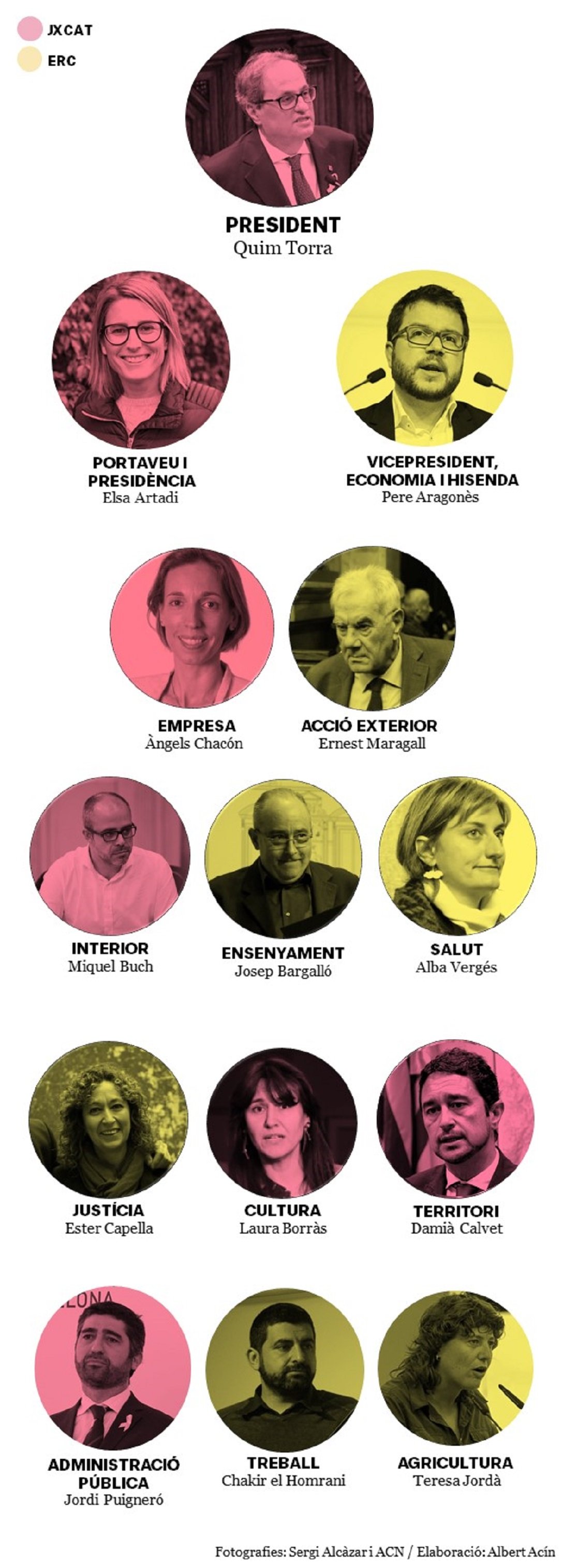 El nuevo Govern mantiene la proporción de representantes de Junts per Catalunya y ERC, con Elsa Artadi y Pere Aragonès —portavoz y vicepresident— que siguen como perfiles fuertes al lado del president Torra. Se incorporan, como novedades en relación al primer nombramiento de Torra del pasado 19 de mayo, los nuevos titulares de Empresa, Territori i Sostenibilitat, Salut y Cultura, Àngels Chacón, Alba Vergés, Damià Calvet y Laura Borràs, respectivamente. Mientras, Elsa Artadi sufre un cambio y asume Presidència.