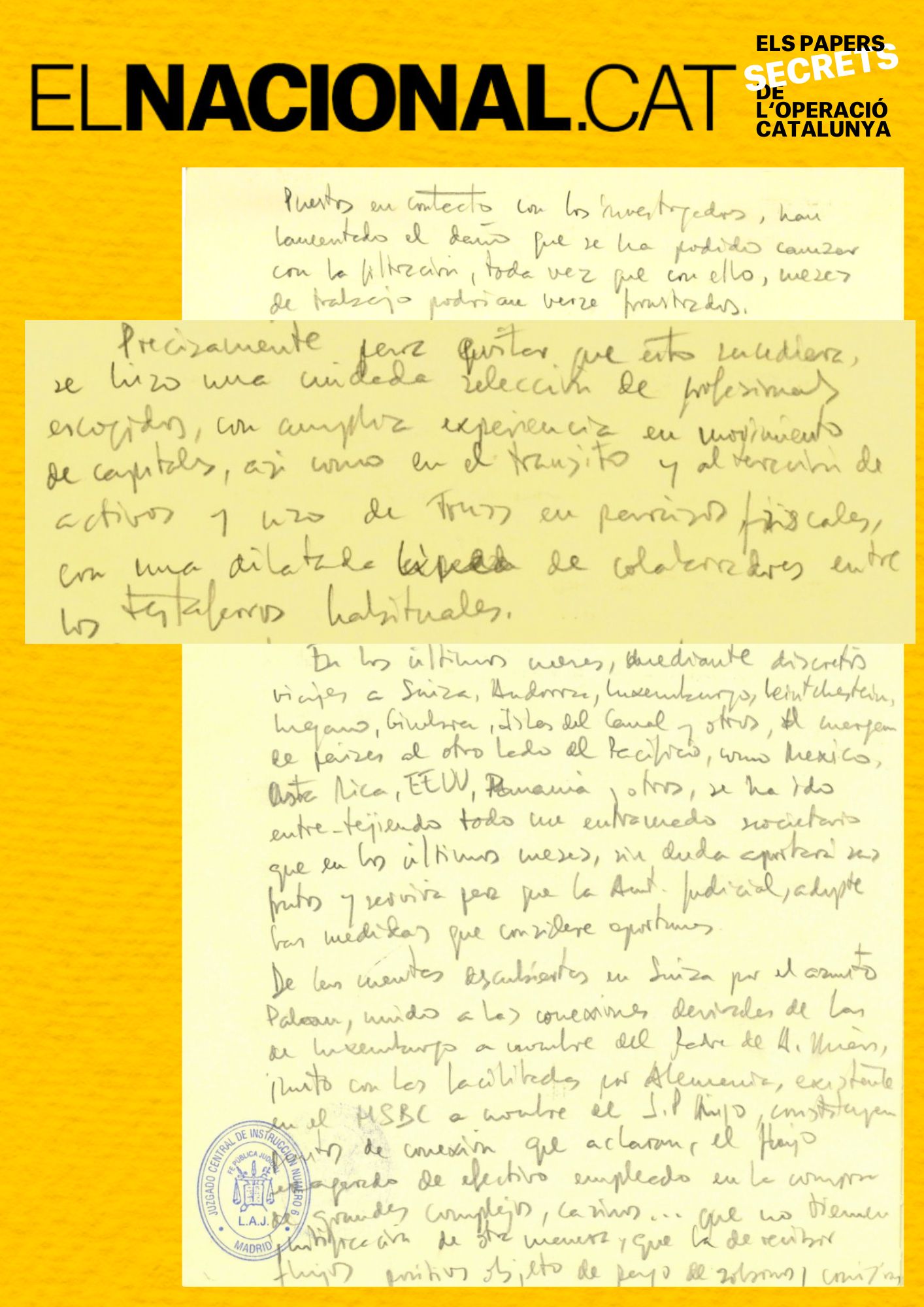 Además, Villarejo en su agenda —que está en posesión del juez de la Audiencia Nacional que lo investiga en la macrocausa de Tándem— sostiene que en las investigaciones contra el independentismo catalán participaban "una cuidada selección de profesionales escogidos, con amplia experiencia en movimiento de capitales". Lo tiene apuntando en la agenda el 17 de noviembre de 2012, en una anotación donde se sacude la responsabilidad por la filtración y publicación en el diario El Mundo del borrador de la Udef, ya que la considera una buena línea de investigación. El comisario apunta que para recoger la información se hicieron "discretos viajes" a Suiza, Andorra, Luxemburgo, Liechtenstein, Ginebra, Islas Caimán, México, Costa Rica, EEUU y Panamá, entre otros, además de referirse a datos "facilitados por Alemania".