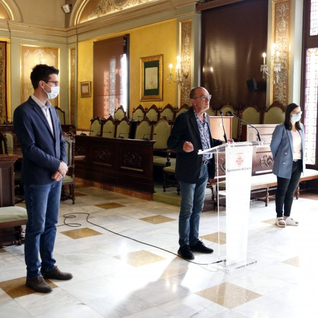 Imagen principal: El alcalde Miquel Pueyo, con los tenientes de alcalde Toni Postius y Jordina Freixanet, presenta la reestructuración del gobierno / ACN