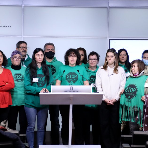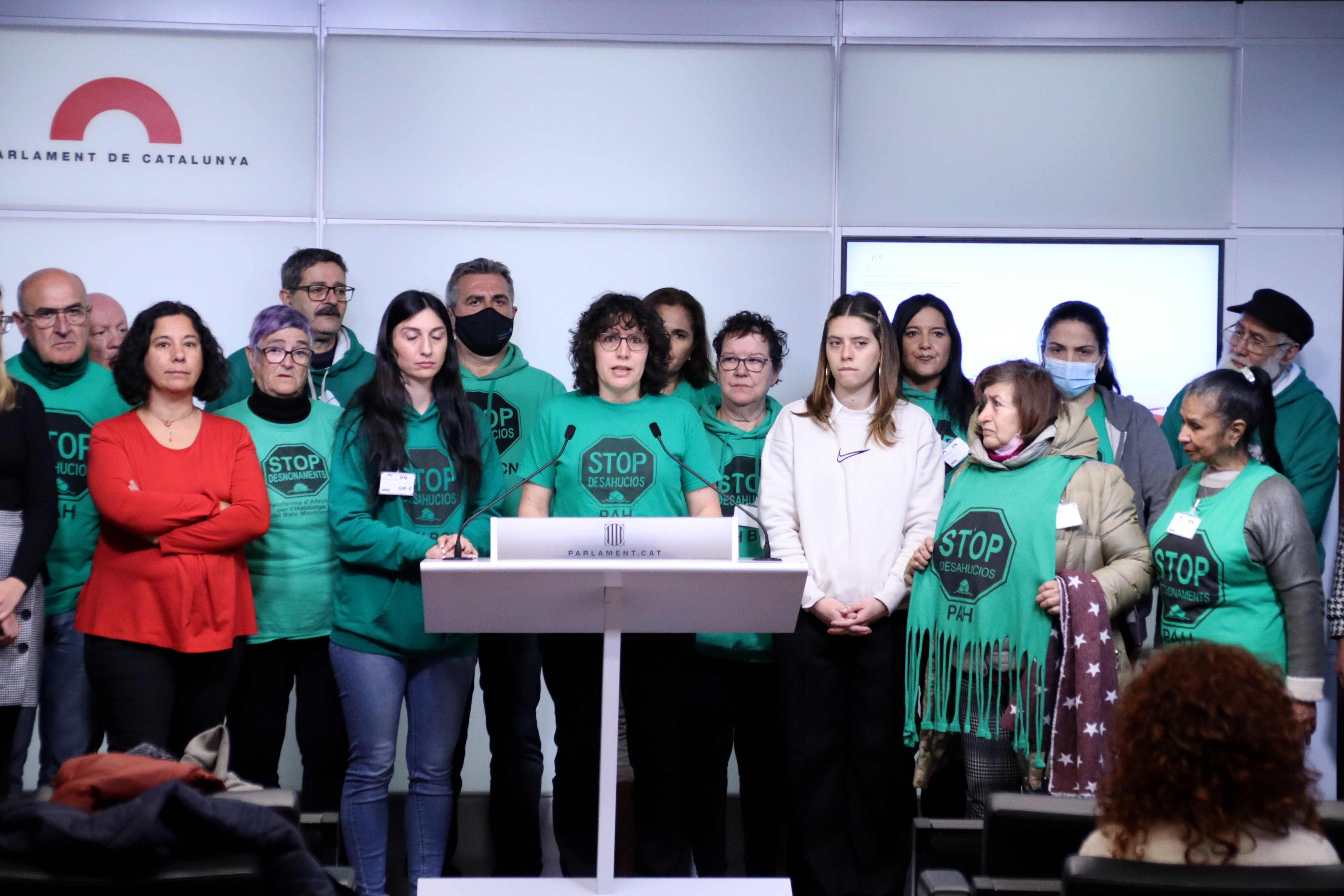 Cuando faltan menos de 24 horas para que, con toda probabilidad, el Parlament apruebe la ley contra las ocupaciones "con alteración de la convivencia vecinal", la Plataforma de Afectados por la Hipoteca ha salido a los atriles de la cámara catalana para evidenciar su rechazo. Acompañada de representantes de ERC, la CUP y los comuns, la portavoz Lucía Delgado ha denunciado que la proposición de ley, presentada por Junts y que contará previsiblemente con el apoyo del PSC si no hay un cambio de última hora, afectará especialmente a aquel sector de la sociedad que se encuentra en una situación más precaria. "Perjudicará a las familias vulnerables que han tenido que ocupar una vivienda vacía de la banca porque no tienen acceso a una vivienda digna", ha advertido Delgado.
