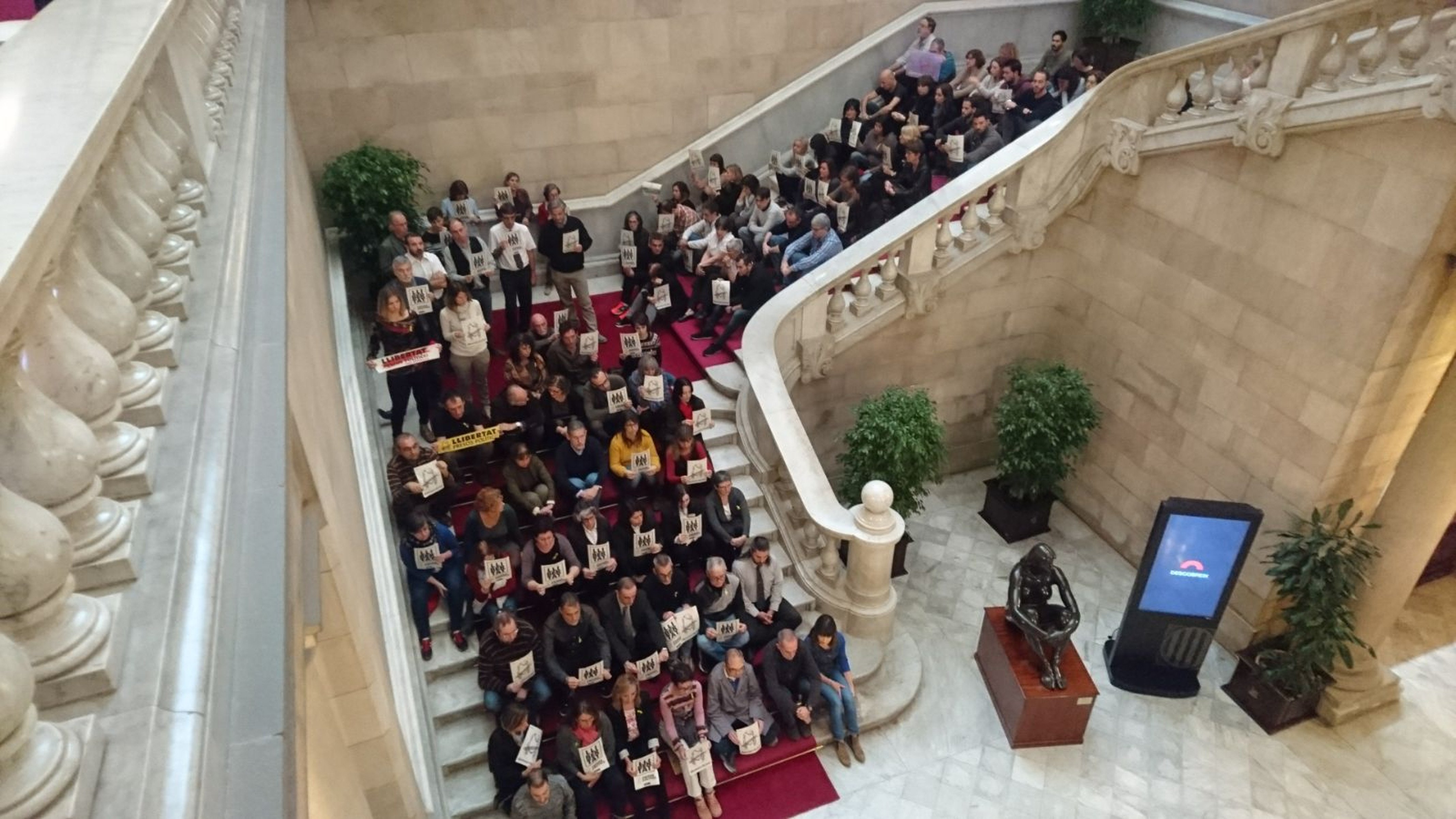 Para hacerlo, han estado un buen rato escenificándolo con una sentada en silencio en la escalinata de honor del Parlament. Gran parte de la plantilla habitual de la cámara se ha concentrado en este punto con carteles que pedían "democracia" y "libertad presos políticos".
