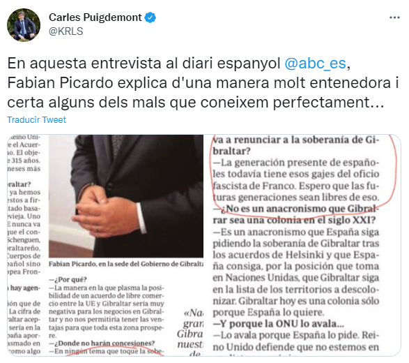 El presidente en el exilio, Carles Puigdemont, ha retuiteado una entrevista que el rotativo español ABC le hizo al ministro principal de Gibraltar y líder del Partido Socialista Laboralista, Fabian Raymon Picardo. El ministro laboralista aseguró en la entrevista que "la generación presente de españoles todavía tiene gajes del oficio fascista de Franco".