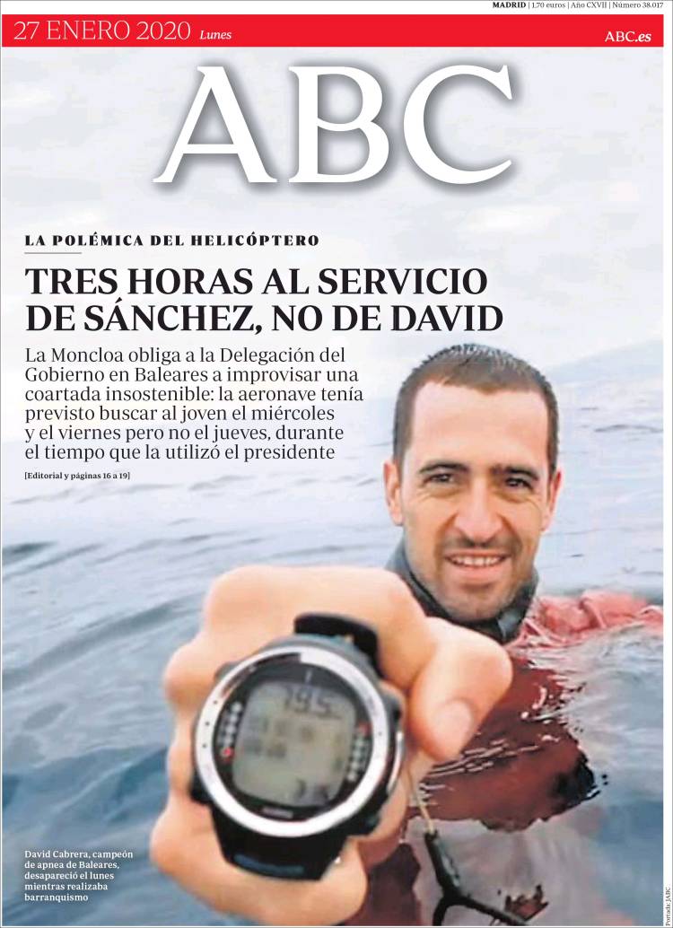 Se cierra el trío con ABC que esta vez pone el foco en el uso por parte del presidente español del único helicóptero de rescate la Guardia Civil en Mallorca para sobrevolar las zonas afectadas por el temporal Gloria en las Baleares e impedir, de esta manera, que se utilizara en la búsqueda del campeón de apnea de Balears, David Cabrera.
