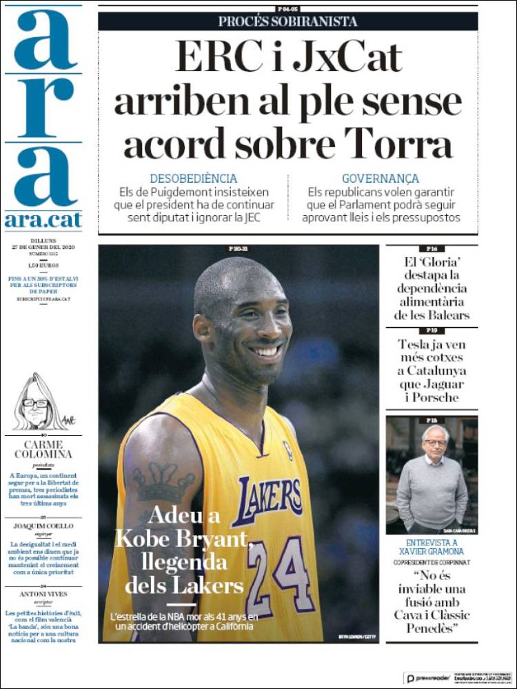 La trágica muerte de la leyenda de la NBA, Kobe Bryant, y su hija en un accidente de helicóptero ocupa este lunes las portadas de los diarios que nos encontramos en los quioscos. Bryant, con suya cálida sonrisa, recibe el reconocimiento que se merece, y no solo en los rotativos deportivos. Empieza así una semana en que cada uno libra su particular batalla, ya sea en el campo de la política española o de la catalana.