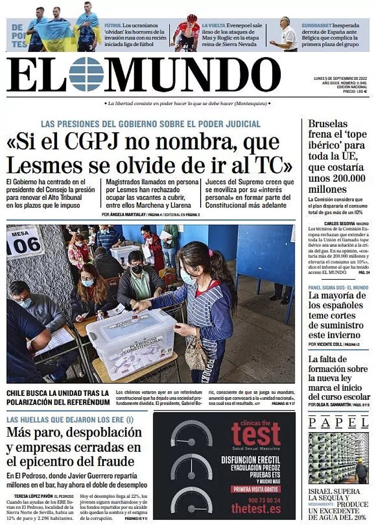 El Mundo sigue con las "presiones" del gobierno sobre el poder judicial y destapa una frase de la judicatura: "Si el CGPJ no nombra, que Lesmes se olvide de ir al TC". El referéndum constitucional de Chile destaca en la fotografía de portada; una gran mayoría ha dicho 'no' a la propuesta de nueva constitución en el país, resultado que mantiene el texto actual, redactado el 1980 por la dictadura militar de Augusto Pinochet y reformado parcialmente durante la democracia. Finalmente, el rotativo también señala que "Bruselas frena el tope ibérico para toda la UE, que costaría unos 200.000 millones."