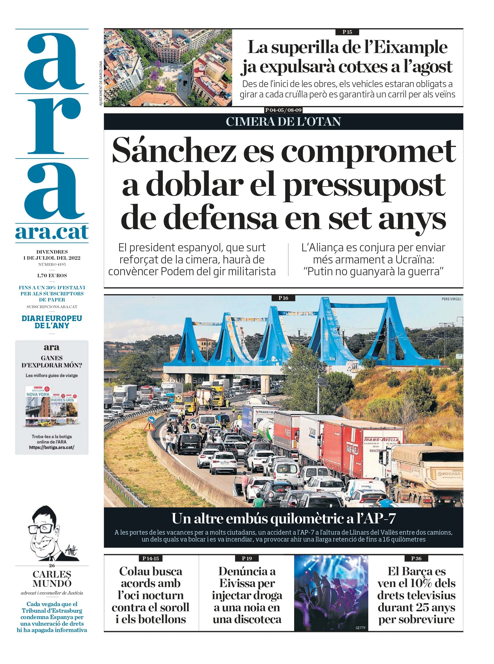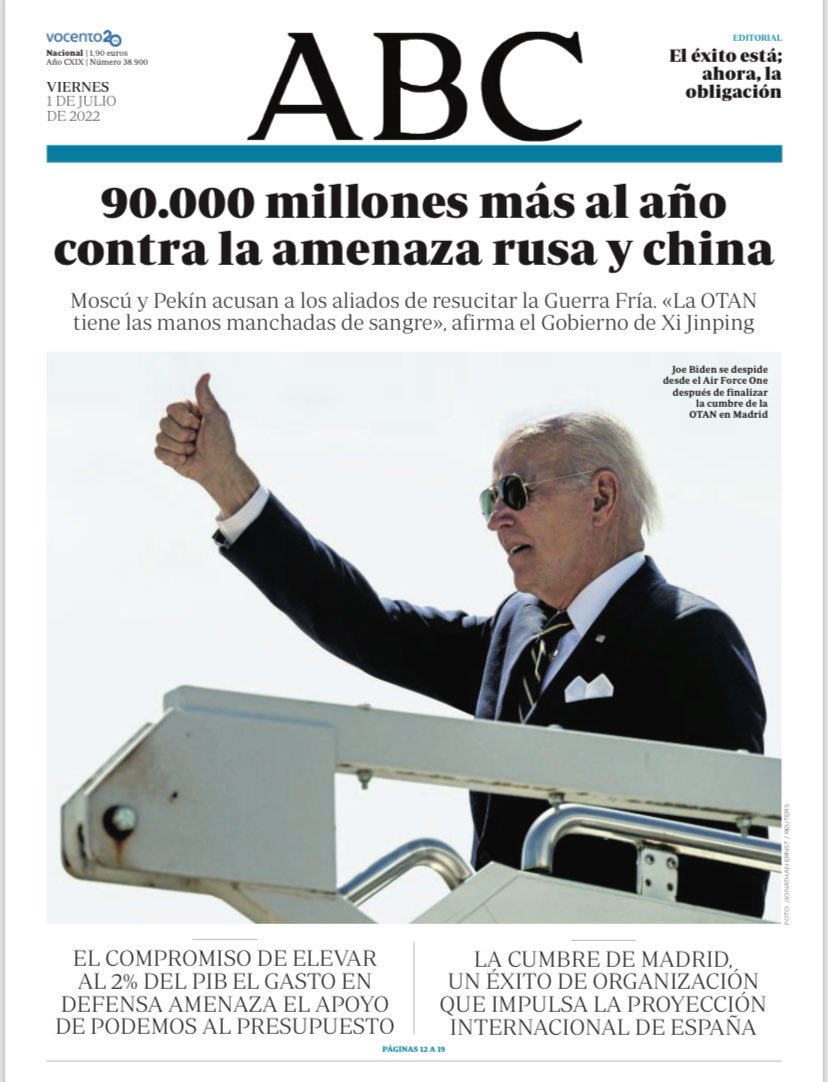 Las portadas de este viernes anuncian que el Gobierno propondrá duplicar el gasto en armas hasta que llegue al 2% del PIB en el 2029. Casi todos los diarios lo disimulan con la expresión “invertir en defensa”, fuera de El País y de El Mundo, que hablan de “gasto militar” y el ABC, que quiere asustarte y lo vende como gastar dinero “contra la amanaza rusa y china”. Podrías decir que no es para tanto que los lectores ya somos adultos y sabemos que todas las expresiones quieren decir lo mismo, etcétera. Error. Piensa qué respuesta darías a la pregunta "¿Le parece bien que España invierta más en el presupuesto de defensa?". Ahora piensa si responderías igual a la pregunta “¿Quieres que España se gaste 90.000 millones al año en armas?”. Hablemos, ¿verdad? Bien, pues eso es lo que ha venido a hacer el presidente de Estados Unidos de América, Joe Biden, en la cumbre de la OTAN de Madrid: a poner firmes a los llamados “aliados” y exigirles que se gasten el 2% del PIB en armas y militares, tal y como se comprometieron al entrar en la Alianza Atlántica. En España, Biden ha salido adelante, porque Pedro Sánchez, el presidente del gobierno español, no ha tardado ni 24 horas en pedir un “pacto de Estado” para aprobar este gasto. Como sabes, es lo mismo que hizo para pacificar la cuestión catalana -o el paro juvenil, no te enfades- y a la misma velocidad.