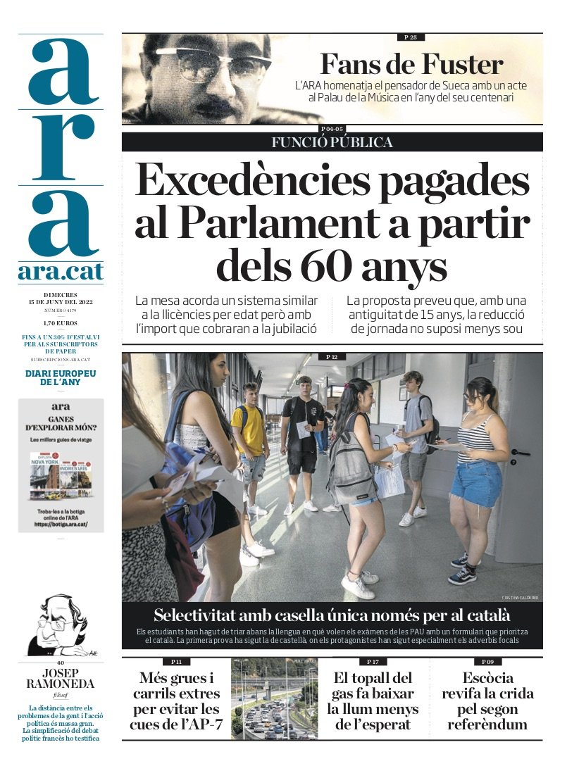 La Vanguardia, sin embargo, se reivindica en el título principal. Explica que el gobierno español prepara una selectividad con temario común para toda España, de manera que el objetivo del ministro del PP José Ignacio Wert de "españolizar a los niños catalanes" se conseguirá gracias a un gobierno socialista en coalición con Unidas Podemos. Porque si el examen se homogeneíza, también lo hace el temario que debe explicarse a los alumnos. Esta es una competencia autonómica, pero ya sabes que todo eso de las autonomías, la descentralización y etcétera, ha pasado un poco a la historia, porque como los catalanes parece que no lo quieren o lo quieren mal, se acabado el disimular, que la vergüenza por lo que se ha hecho históricamente con Catalunya hace años que se ha perdido. Aquí Jordi Barbeta volvería a reírse un poco del "gobierno más progresista de la historia" y Montserrat Dameson reaccionaría con torería, como en la columna de este miércoles, aquí cerca, a la decisión del departament d'Universitats de acatar que el catalán deje de ser la lengua por defecto en la selectividad. En el fondo, la primicia de La Vanguardia sólo recuerda el estado actual de cosas y, en concreto, que si no te encargas tú de la lengua y de tus cosas, nadie lo harà. Por lo tanto, en 2024, selectividad homogénea española al canto, se rompa el Estatut o los consensos que hasta ahora habían regido el llamado "encaje" de Catalunya en España, que se deshacen como un terrón de azúcar cuando conviene mantener la unidad del Estado o la recaudación fiscal.
