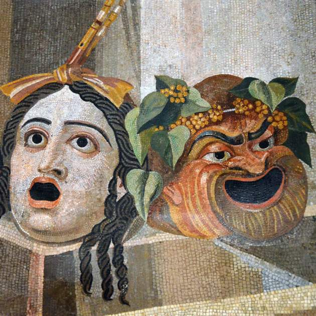 Imagen principal: máscaras tragicómicas del teatro griego antiguo representadas en el mosaico de la Villa Adriana, en el siglo II a.C. / Musei Capitolini - Wikimedia Commons