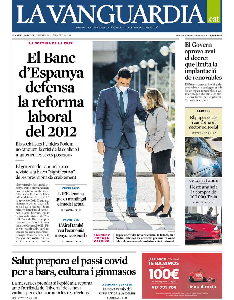 Cabe decir que este título es bueno para el Trío de la Bencina —y un poco para La Vanguardia y El Punt Avui, que suenan la misma letra con una música diferente. El diario de los Godó es un búnker en defensa de la reforma laboral aprobada por el PP en 2012, que es el casus belli que resquebraja la coalición de gobierno entre PSOE y Unidas Podemos. Pero hay algunas portadas que, al contrario, aprietan los dientes al informar de esa tensa situación, como la de El País, que abre con las disensiones entre los socios de gobierno en Madrid pero se esfuerza por no describirlas con ninguna palabra o expresión crítica o negativa. Al contrario, da a entender que apenas ha sido una reunión de tantas, con ese buen rollito, y que las negociaciones seguirán. Tutto a posto.