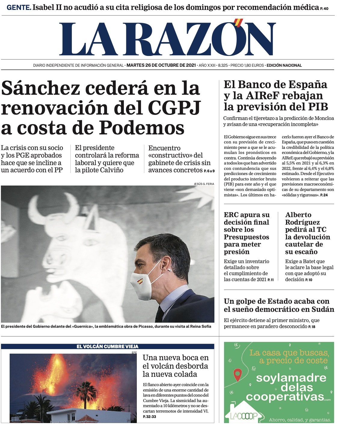 Esta coalición lo tiene complicado. Ha perdido a un diputado (Alberto Rodríguez dorme coi pesci) por la claudicación de la presidenta socialista del Congreso ante el Tribunal Supremo —y ningún diario de los que aquí se comentan ha dicho ni pío ante la injerencia del TS en el legislativo—. Más complicado lo tiene el gobierno en sí, con mucho trabajo pendiente si quiere salvar la fractura y cumplir sus promesas electorales: la anulación de la ley mordaza, la reforma de las pensiones, el precio de la luz, la renovación y despolitización del Poder Judicial, la reforma del delito de sedición, la ley de la vivienda, la protección de las lenguas que no son el español, la regulación de la prostitución... En los diarios de hoy no faltan adversarios, sean las previsiones a la baja del Banco de España y de la Autoridad Independiente de Responsabilidad Fiscal o las peticiones del Instituto de Empresa Familiar, un lobby, todas bien promovidas en las portadas de hoy.