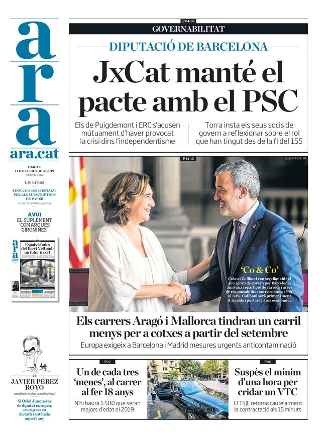 La Vanguardia y El Periódico dan la impresión de que no saben qué les pasa del gozo que sienten porque comunes y socialistas ("Co&Co", como dice Ara con un deje pelín cursi) hayan pactado el cartapacio municipal de Barcelona y se hayan fotografiado con pinta de pareja que acaba de casarse o, en el caso del diario de los Moll, que anuncia la llegada de un hijo, porque alumbran —dan a luz.