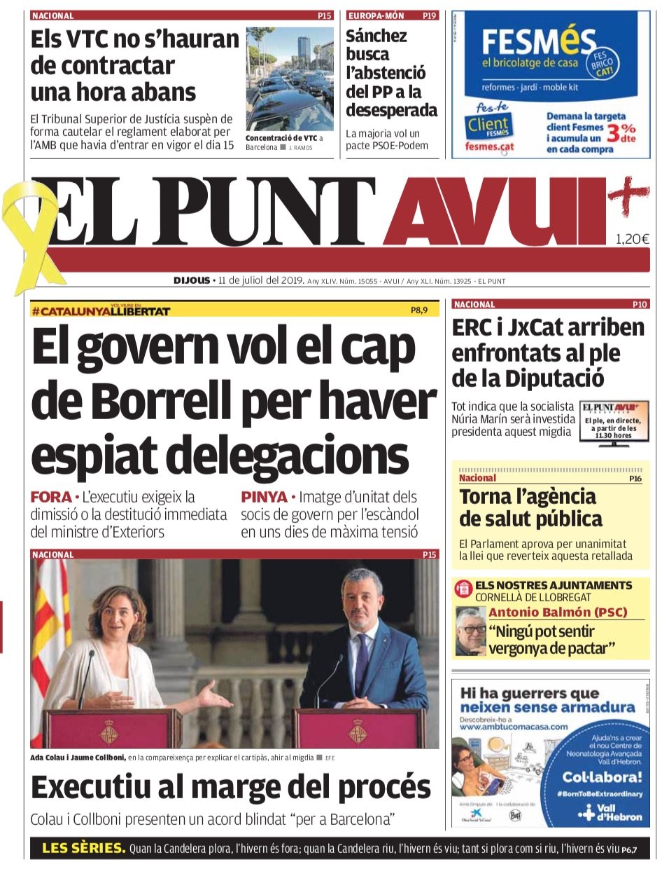 El Punt Avui es lo único que abre con el espionaje del ministerio de Exteriores de Josep Borrell a las delegaciones catalanas en el exterior, cosa que le va de maravilla para destacar que los dos socios enemistados del Gobierno exhiben unidad, determinación y etcétera, porque al menos van juntos en esta cuestión. Es gracioso como El Mundo aborda este asunto. Dice que el Govern ha puesto en marcha una "campaña de descrédito" de Borrell. Si lo dicen ellos, que en "campañas de descrédito" han hecho todos los másters y un doctorado...