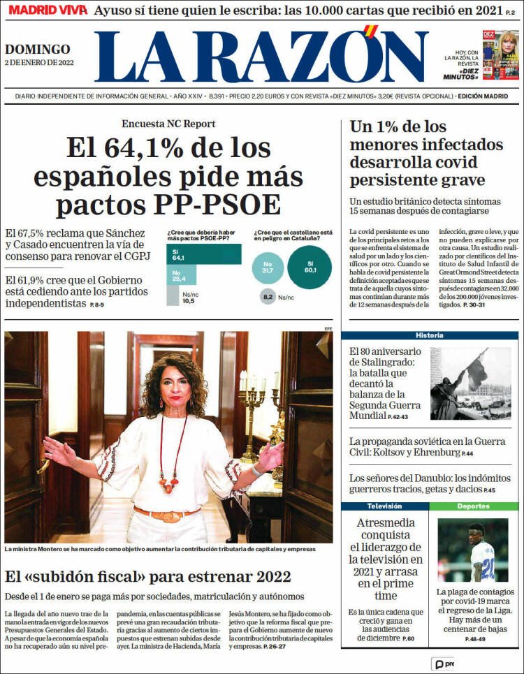 Desde La Razón, también arrancan el 2022 con una encuesta que da alas al bipartidismo: "El 64,1% de los españoles pide más pactos PP-PSOE". El medio señala el amplio apoyo a un mayor entendimiento entre socialistas y populares en cuestiones como, por ejemplo, el Consejo General del Poder Judicial: casi 7 de cada 10 de los encuestados quieren que Sánchez y Casado lleguen a un acuerdo en esta materia. No podía faltar, tampoco alguna mención al independentismo: un 61,9% "cree que el Gobierno está cediendo ante los partidos independentistas" y el sondeo también indica que el 60,1% cree que "el castellano está en peligro en Catalunya". Dos clásicos. Finalmente, el incremento de los impuestos de sociedades, matriculación y cuotas de autónomos también centran la portada de La Razón.