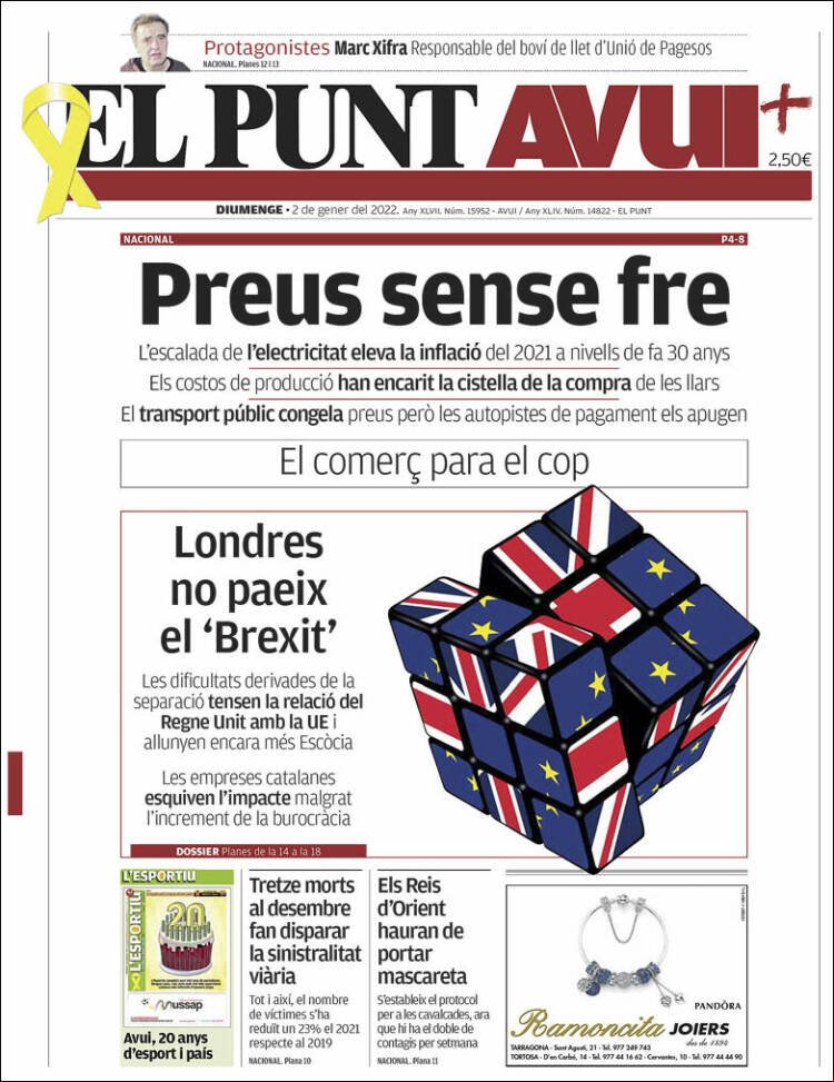Finalmente, El Punt Avui centra la portada del domingo en la inflación de los servicios y los productos: "Precios sin freno". Indican en los subtítulos que "la escalada de la electricidad eleva la inflación a niveles de hace 30 años", que "los costes de producción han encarecido la cesta de la compra de los hogares" y que "el transporte público congela precios pero las autopistas de pago les suben". Paralelamente, el primer aniversario de la entrada en vigor del Brexit es el asunto del dosier de este domingo.