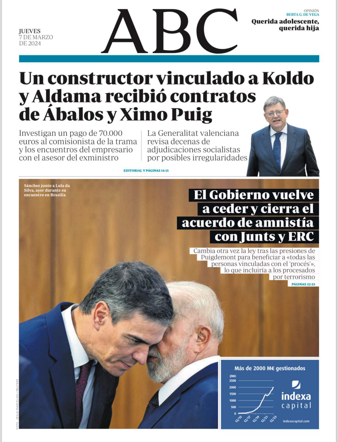 Todas las portadas abren este jueves con el pacto sobre la ley de la amnistía acordado entre el PSOE, Junts y ERC. Las primeras páginas del Trío de la Bencina lo interpretan como una cesión más de Pedro Sánchez, a quien presentan derrotado por Carles Puigdemont. Una prueba más de que al búnker mediático español le saca de quicio la perspectiva de que el president deje de ser un exiliado y vuelva a hacer vida normal —la que él elija, como todo el mundo—, y el miedo a que vuelva a presentarse a las elecciones. El Mundo consigue reunir en la misma frase "Sánchez", "Puigdemont" "amnistía", "crisis" y "corrupción". Es un nuevo récord. Este título es cómico porque la relación entre esos conceptos es tan forzada que daría para hacer un juego —podría llamarse "Titula como El Mundo"— que exigiría mantener el primer sintagma de la frase y, por cada sintagma añadido, el jugador gana un punto. Por ejemplo: "Sánchez da a Puigdemont amnistía total... (este sería el sintagma fijo) ...en plena disputa de la Champions"; "...en plena sequía"; "...en plena celebración de la feria Arco"; "...en plena celebración de las primarias en EE.UU."; "...en plena ofensiva israelí en Gaza"; "...en plena fiesta mayor de Villalpando". Etcétera. Al revés sería más complicado porque la frase resultaría confusa: "El Madrid avanza en la Champions en plena crisis de corrupción"; "El Rey inaugura Arco en plena crisis de corrupción"; "Trump gana el nombramiento republicano en plena crisis de corrupción". Queda claro que esta segunda variante del juego no funcionaría salvo, quizás, en el último título.