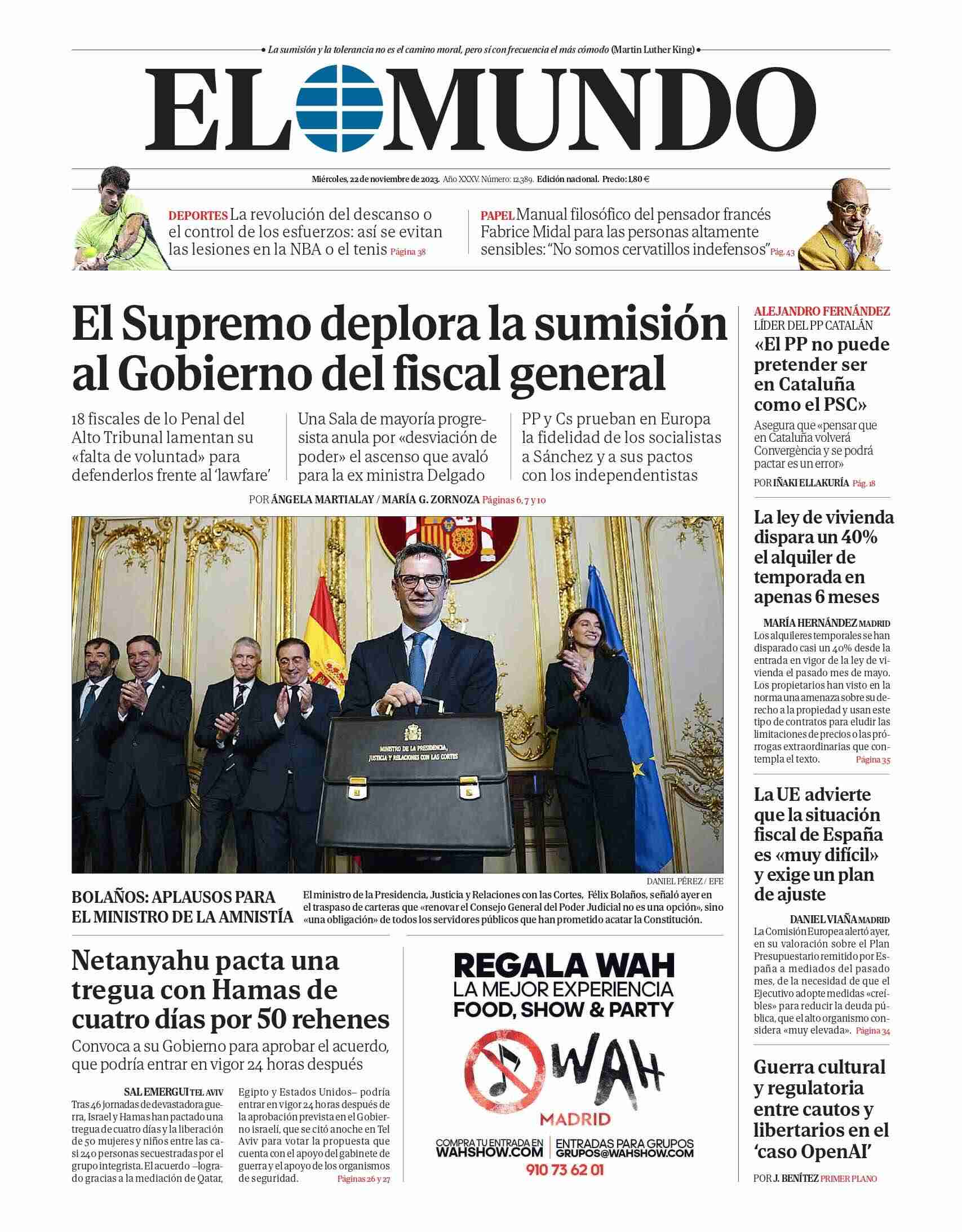 La mayoría de las portadas tratan varios episodios del alboroto en la justicia española, encabronada con la ley de amnistía y, antes, por los acuerdos entre el PSOE y Junts donde se menciona el concepto lawfare, el uso político de la justicia como un arma contra los adversarios. Por una parte, el juez Manuel García Castellón, de la Audiencia Nacional —promovido y patrocinado por el PP de hace dos décadas—, ha trasladado al Tribunal Supremo la investigación por terrorismo de la causa de Tsunami Democràtic, que incluye el president exiliado, Carles Puigdemont, y a la secretaria general de ERC, Marta Rovira, residente en Suiza. Además, el Supremo ha anulado el nombramiento como fiscal de sala de Dolores Delgado, exministra de Justicia y exfiscal general del Estado con Pedro Sánchez. Las portadas no tratan juntos estos dos casos, cuya sustancia es muy diferente. Al mismo tiempo, 18 fiscales del Supremo han criticado al fiscal general, Álvaro García Ortiz —nombrado por el anterior gobierno de Pedro Sánchez—, por no levantar la voz contra las acusaciones de lawfare.