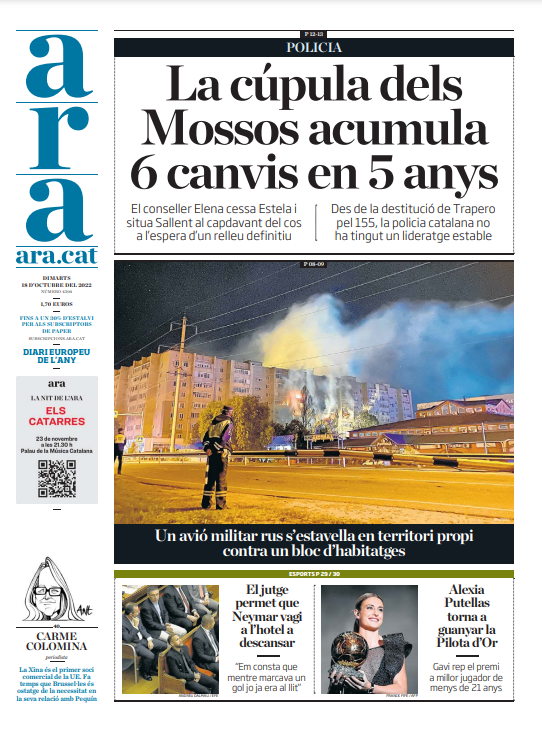 Los diarios impresos, en portada, no acaban de decirlo bien. El Periódico es el único que dice en el título principal que el cuerpo policial está "en crisis". Los otros se limitan a hacer el título administrativo y frío que te da los hechos y no te explica nada. Un poco como The New York Times con la muerte de Marilyn Monroe —viene a cuento después del éxitazo de la peli de Netflix con Ana de Armas—: Marilyn Monroe Dead, Pills Near ("Marilyn Monroe muerta; [había] píldoras cerca"). Los lectores deducían que la actriz se había suicidado con las píldoras pero nunca podrías acusar al diario de haberlo dicho.