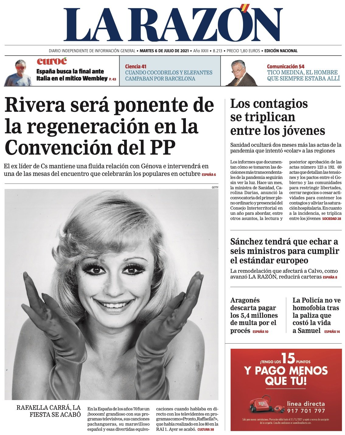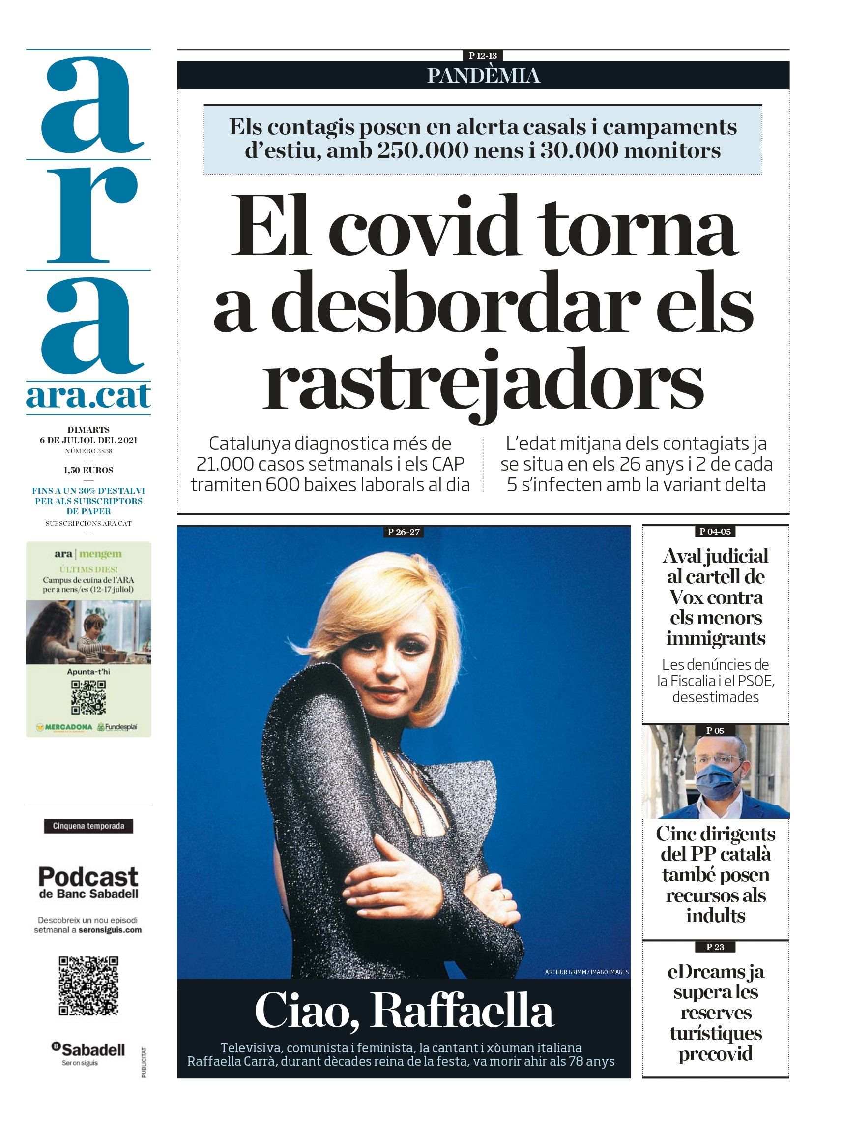 Lo que más se ve este martes en todas las portadas es la fotografía de Raffaella Carrà, muerta este lunes en Roma, a quien todos los diarios —salvo ABC y El Punt Avui, que no la llevan, y La Vanguardia, que escoge otra foto principal— presentan en el mejor momento de su carrera como show-woman televisiva con imágenes de las décadas de los años 70 y 80 del siglo pasado, en las que aparece sonriente y con ademán travieso y vestida de fantasía, con lentejuelas, alas o un chándal exclusivo, guantes largos, copa de champán al aire o un teléfono de lujo. Todas las portadas celebran como la Carrà cambió la manera de hacer el entretenimiento en televisión en Italia y en España y como sus programas y canciones contagiaban alegría en un momento más bien incierto, gris y desanimado de la historia de España y de la vida de tanta gente.