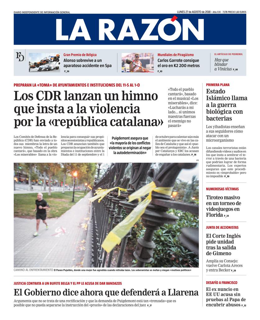 Con todo eso y el hecho de que los Comités de Defensa de la República (CDR) estarían distribuyendo la letra a todos sus miembros, el diario madrileño La Razón tiene suficiente coartada para vender su tema principal de portada de este lunes: "Los CDR lanzan un himno que insta a la violencia por la 'república catalana'", todo porque el texto, un llamamiento a la revuelta contra la injusticia, contiene frases como "lucharás mi lado" o "si unimos nuestras fuerzas el enemigo no pasará". La letra, por cierto, también incluye la explícita frase "más allá de la mentira y la violencia hay la paz".