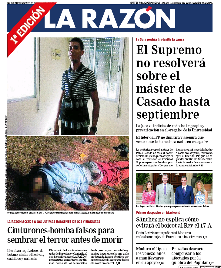 En la misma línea, La Razón también se abona en la idea de que desgastar a Sánchez es socavar al independentismo y viceversa. "Sánchez no explica cómo evitará el boicot al Rey el 17-A", titula en portada el rotativo del comisario Marhuenda, también haciendo la jugada de responsabilizar al presidente socialista de lo que pueda pasar.