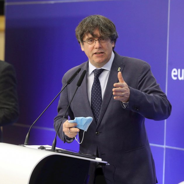 Imagen principal: El presidente Carles Puigdemont en una rueda de prensa desde el Parlamento Europeo / EFE