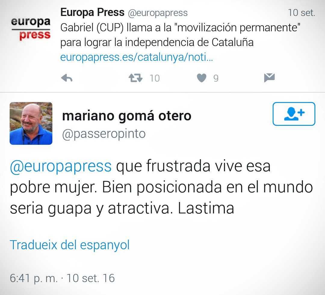 "Que frustrada vive esta pobre mujer. Bien posicionada en el mundo sería guapa y atractiva. Lástima", dijo Gomà en un tuit, ahora ya borrado. Aunque después ha pedido perdón por haberse expresado así, las críticas no han parado.