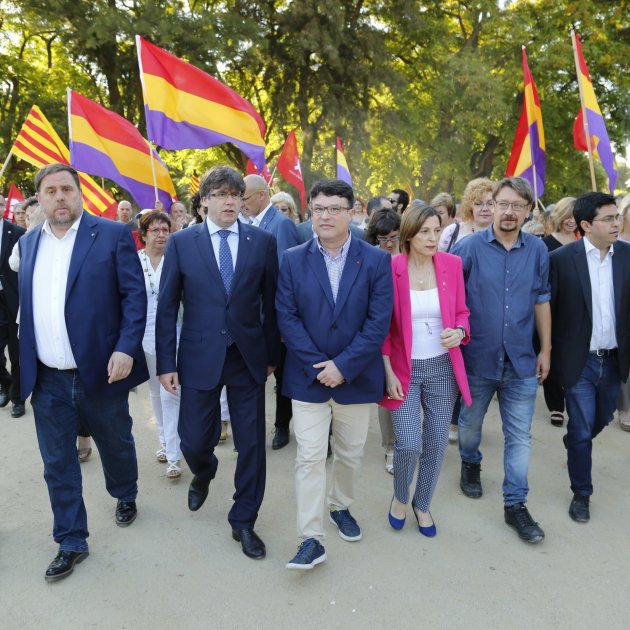 La única vez que acompañantes que no debían entrar al TSJC subieron las escaleras para hacer la foto fue hace un mes cuando fueron a declarar Lluís Corominas y Ramona Barrufet. La presidenta del Parlamento Carmen Forcadell y el resto de la Mesa le acompañaron todo el camino hasta arriba en la puerta. Las otras veces, como el día de Forcadell y Anna Simó, sólo habían ido hasta arriba los citados a declarar.
