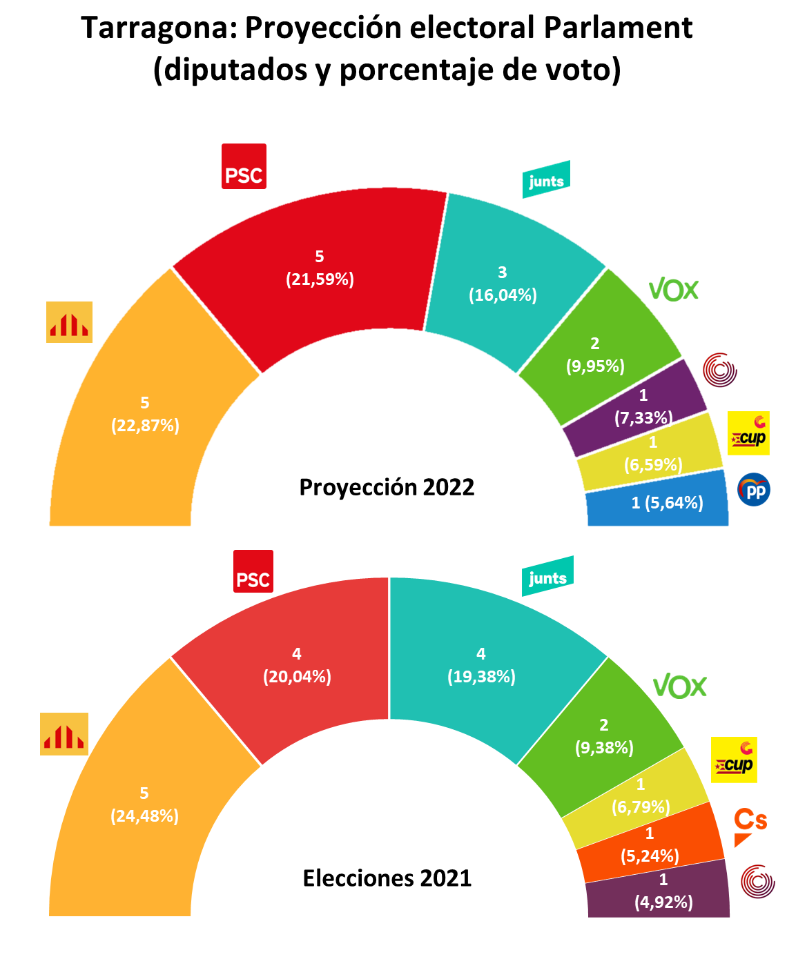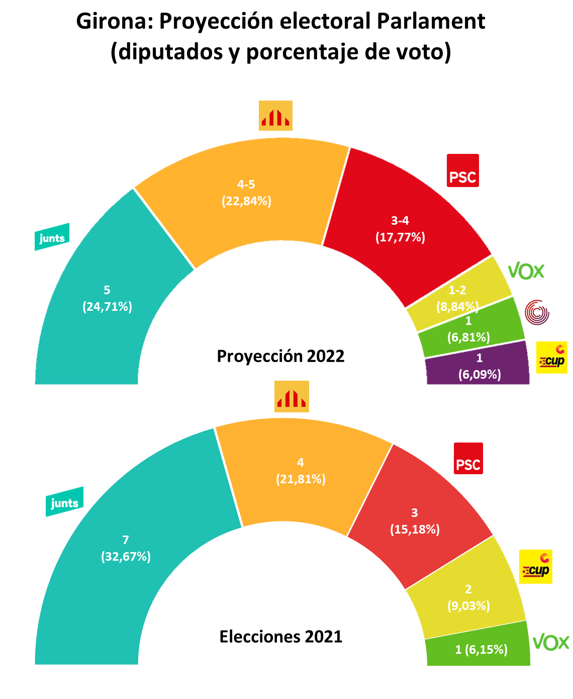 Por demarcaciones, el PSC mantendría la primera posición en la provincia de Barcelona, con 22-23 escaños (23 en las anteriores elecciones), ERC sería segunda fuerza con 18-19 (ahora, 19) y Junts tercera, con 13-14 (16 actualmente). En Tarragona, ERC repetiría al frente del ranking con 5 escaños (como ahora), seguida del PSC, que empataría con 5 (actualmente, 4) y Junts, con 3 (tiene 4 ahora). En Girona, Junts seguiría siendo la fuerza con más votos y escaños (5) pero perdería 2 (7 en el 2021), ERC sería segunda fuerza con 4-5 escaños (4 actualmente) y el PSC tercera, con 3-4 (3 en el 2021). El cambio de hegemonías se produciría en Lleida, donde ERC, con una horquilla de 4-5 escaños (5 en el 2021) haría el sorpasso a Junts, que sería segunda fuerza con 4 (5 en el 2021); los socialistas, con 3 escaños, se mantendrían como tercera fuerza.