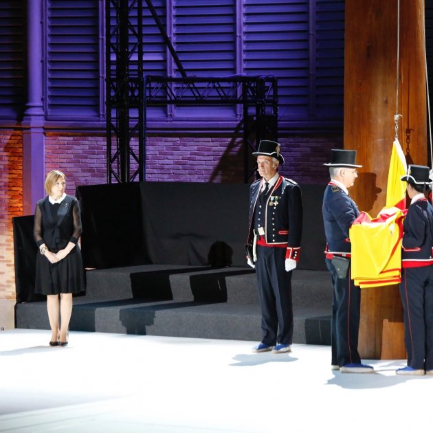 Al llegar Puigdemont y Forcadell, han pasado revista a una formación de gala de los Mossos D'Esquadra y se ha hecho la izada de la bandera mientras la orquesta de cámara Terrassa 48 y el coro de cámara Anton Brückner interpretaban El Cant de la Senyera. El público que seguía el acto desde el Born lo ha acogido con gritos de "independencia".