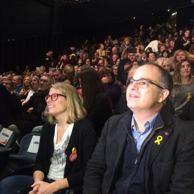 El candidato, que ha tenido que interrumpir su discurso por la emoción, ha hecho subir antes de empezar su intervención a la esposa de Jordi Sànchez, que estaba en el teatro de Parets, donde se hacía el acto, para darle un abrazo y entregarle una rosa amarilla que le habían regalado.