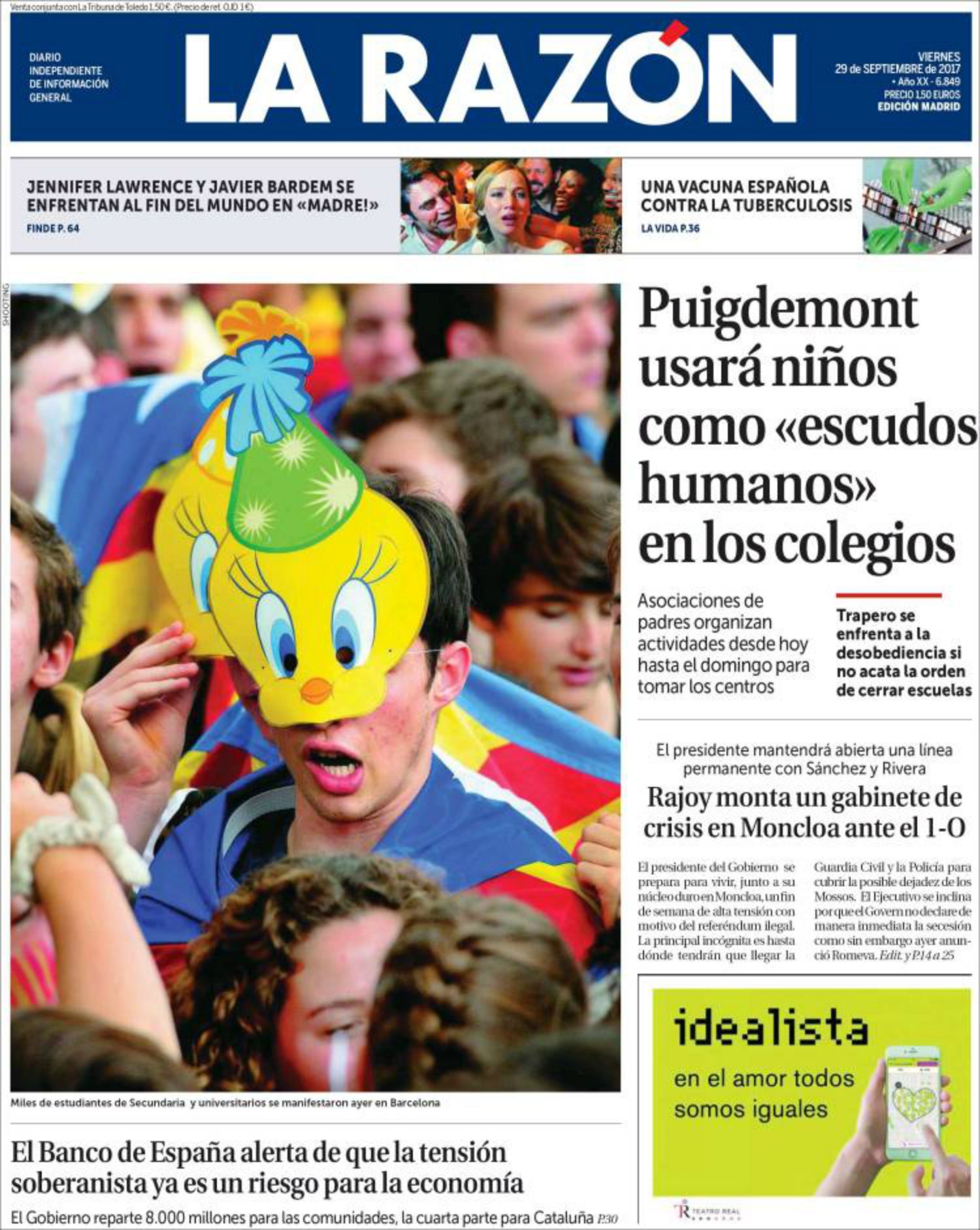 El diario La Razón ha vuelto a cargar contra el Govern, esta vez utilizando los menores en la misma portada. El diario de Planeta asegura que "Puigdemont utilizará a los niños como escudos humanos en los colegios" en portada, acompañado de un texto que explica que algunas asociaciones de padres y madres están preparando actividades en las escuelas para esquivar el requerimiento de la Fiscalía de impedir la utilización de los locales para el referéndum del 1 de octubre.